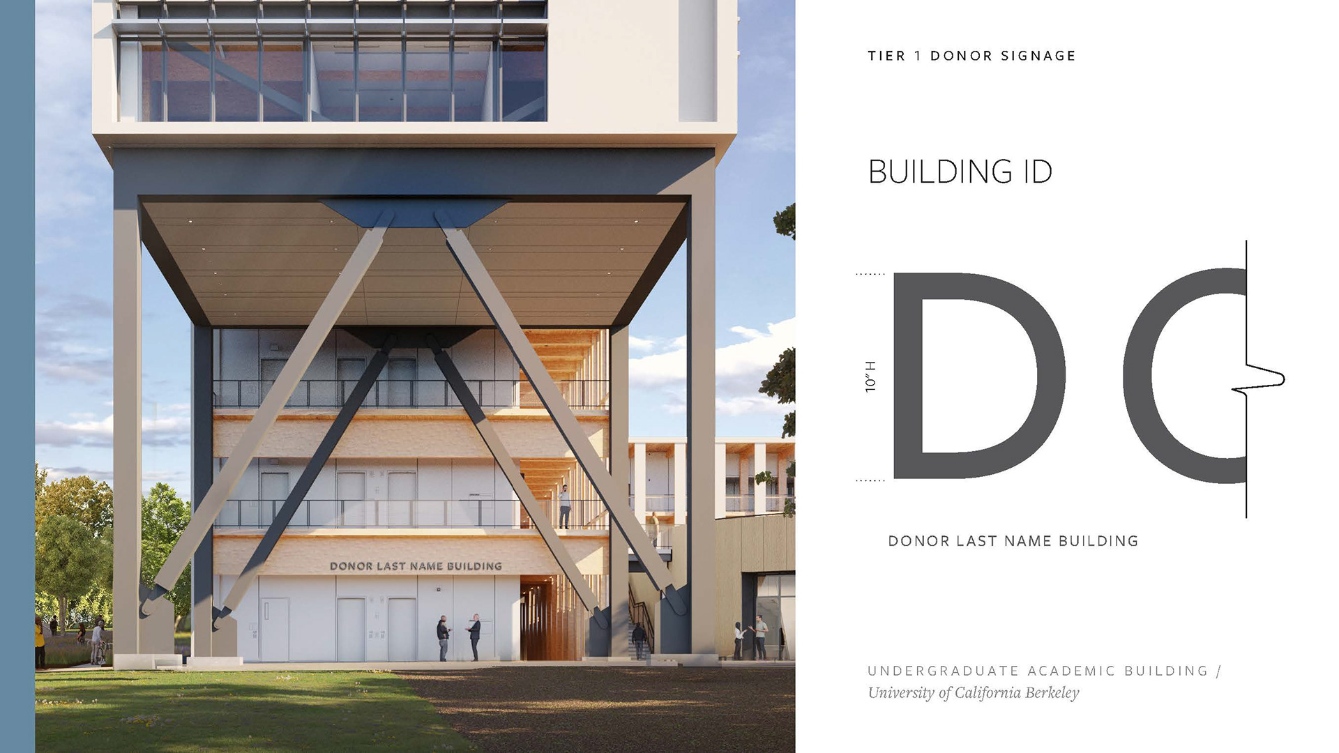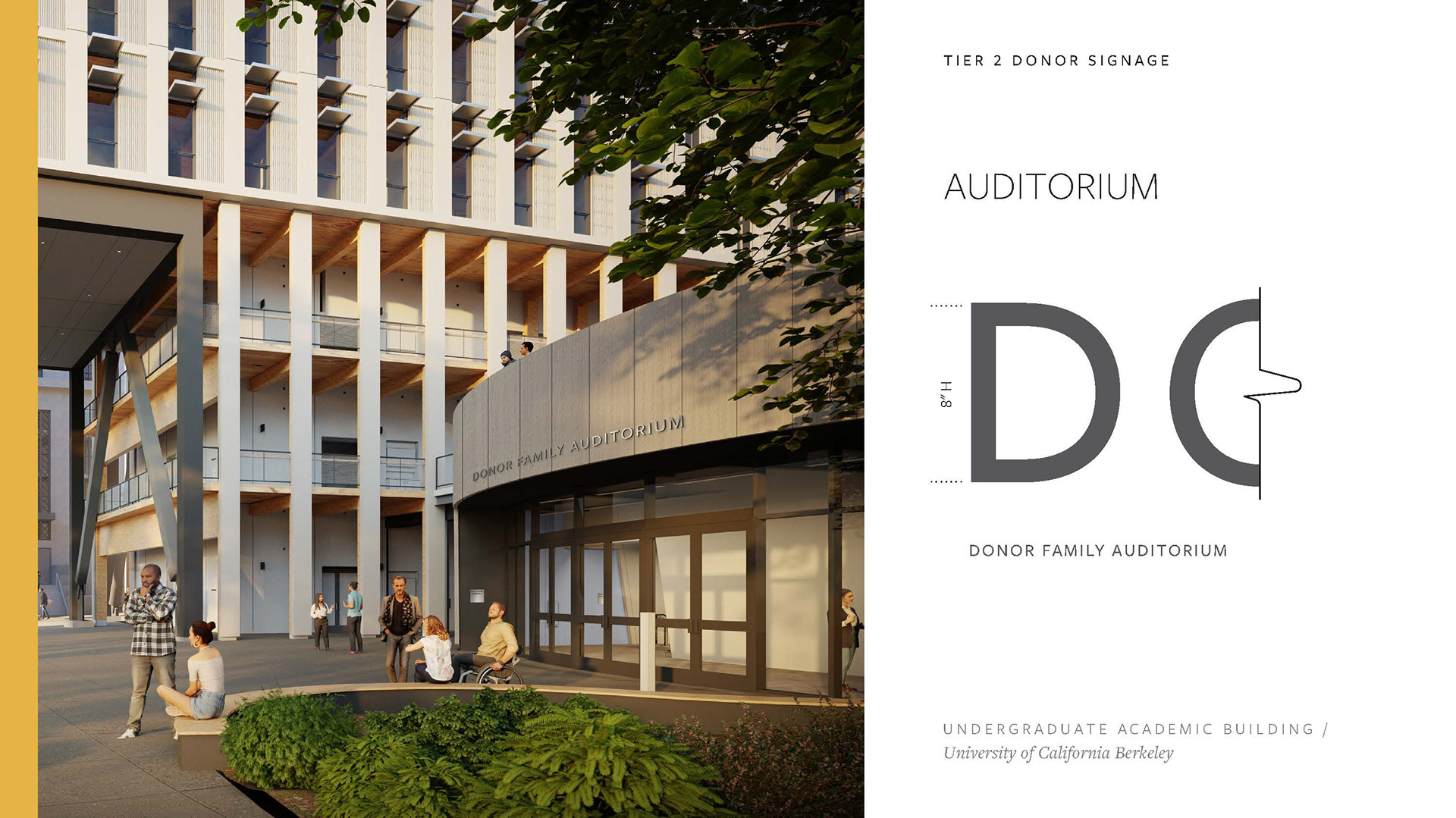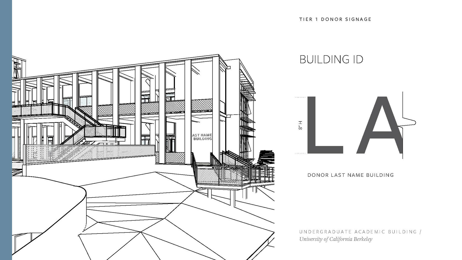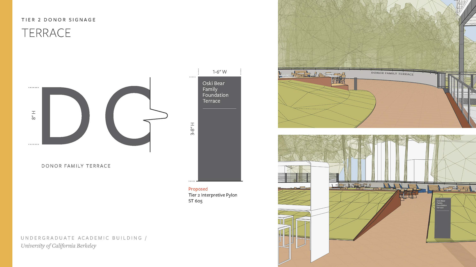 Created a Donor Tier strategy deck including renders of potential signage placement, options, and applications per UC Berkeley donor signage precedent. Worked with project managers and architects to complete and refine the set of renders and elevations to be shared with the clients, with an end goal of making a seamless Donor Signage book for the project.