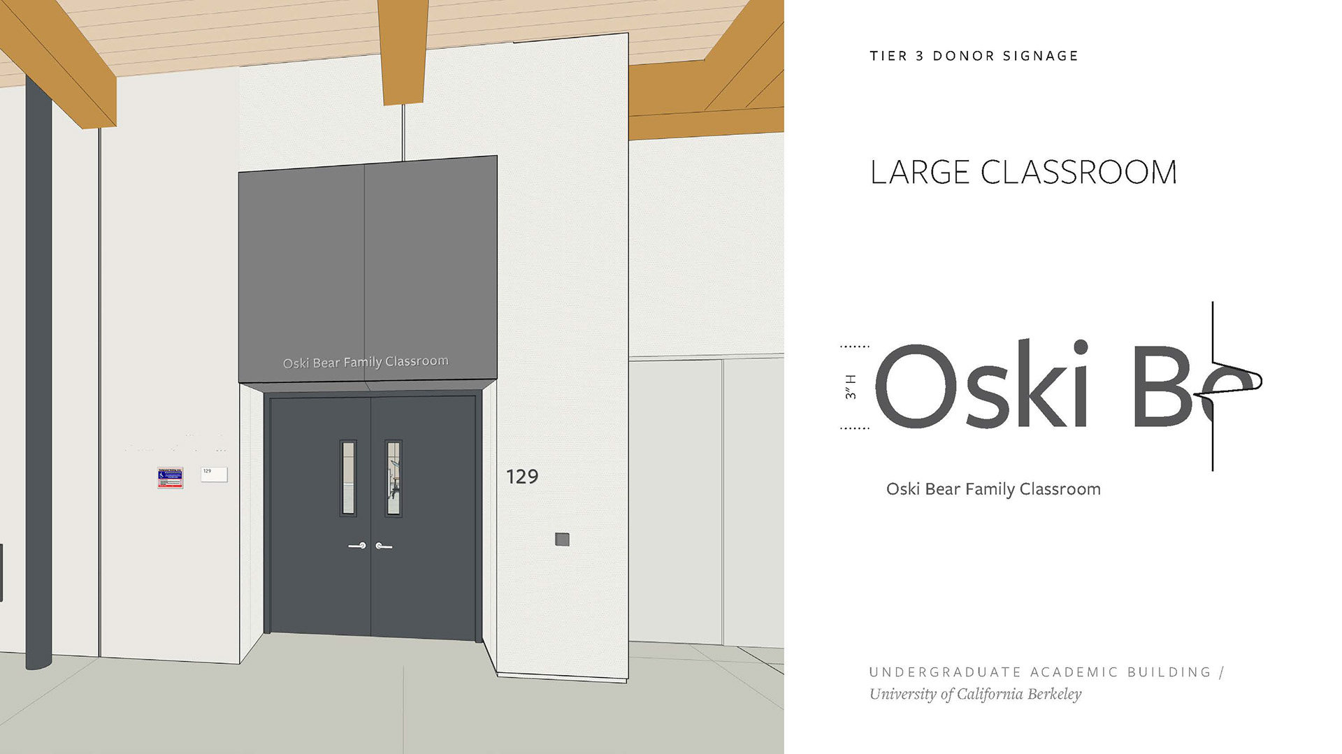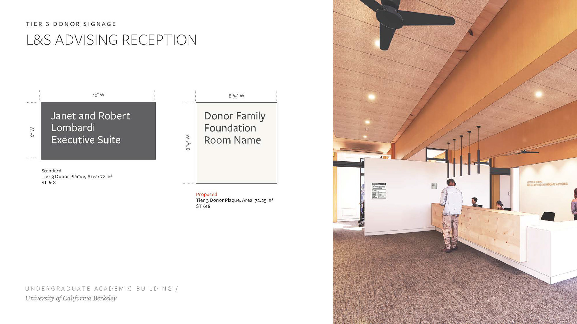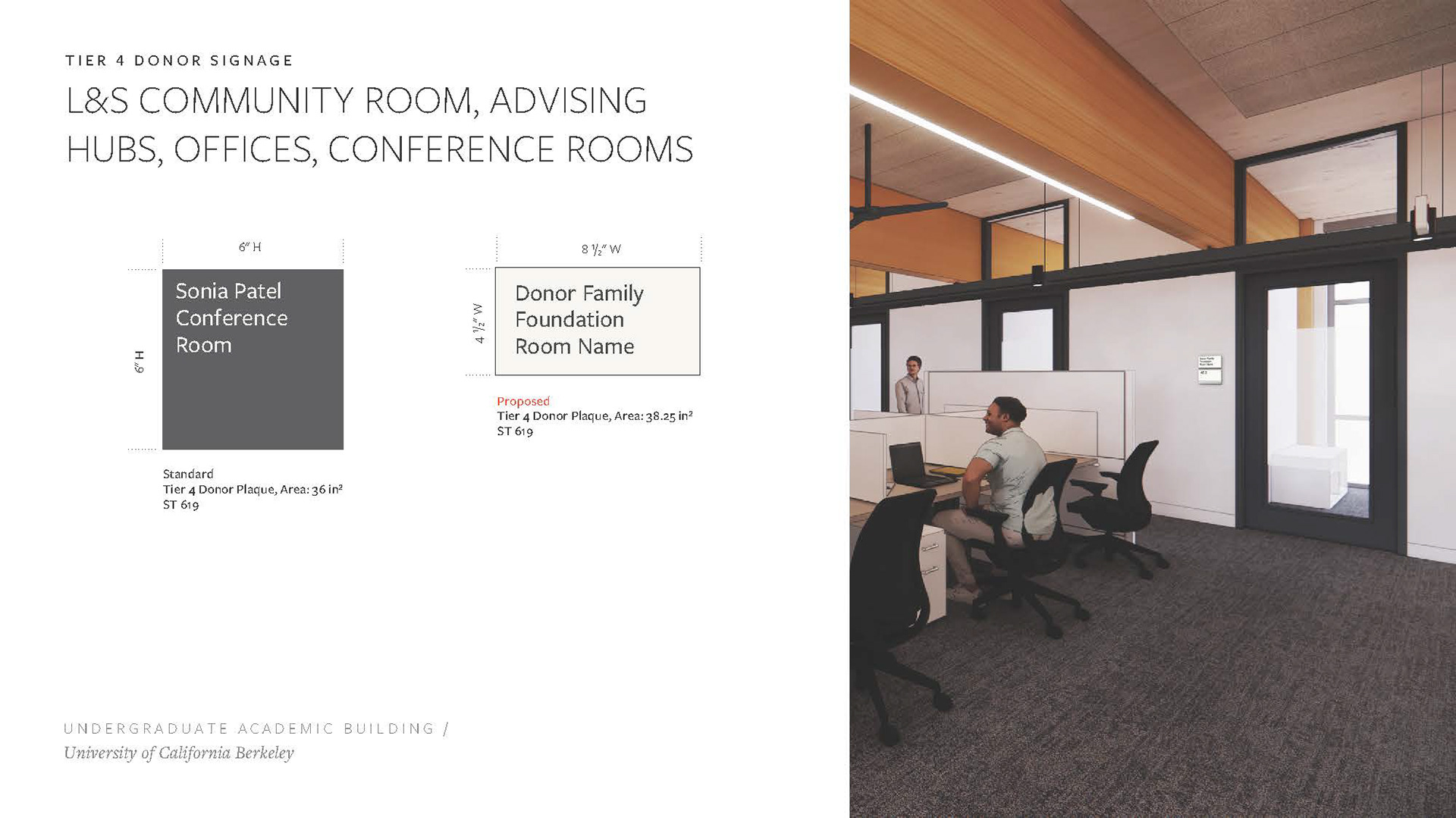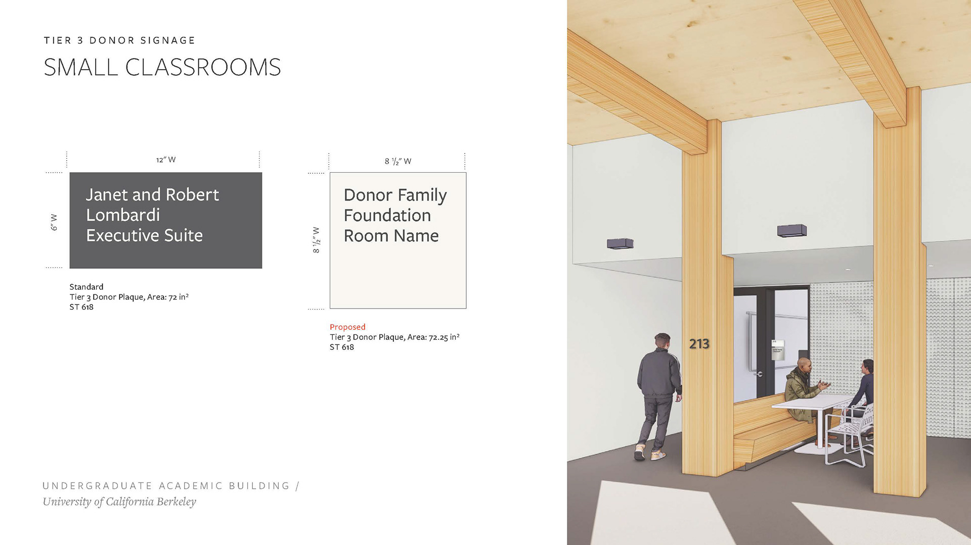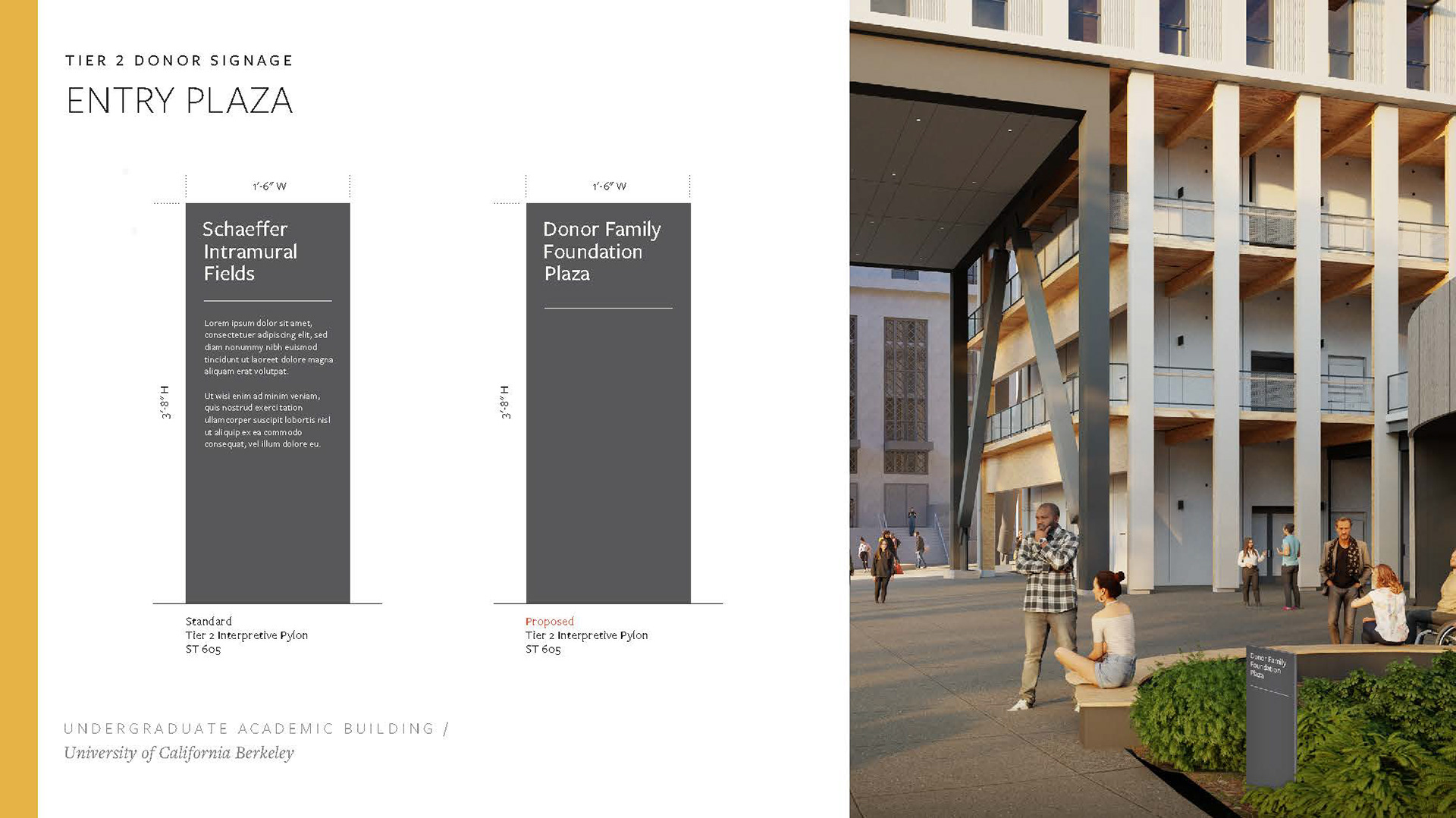 Created a Donor Tier strategy deck including renders of potential signage placement, options, and applications per UC Berkeley donor signage precedent. Worked with project managers and architects to complete and refine the set of renders and elevations to be shared with the clients, with an end goal of making a seamless Donor Signage book for the project.